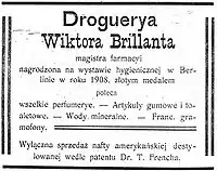 - "Galicja i jej Aptekarze Wiktor Brillant Pharmacy in Jaroslaw a Research about pre WW2 pharmacies in Polish" (PDF). Podkarpacka Okr´gowa Izba Aptekarskaw Rzeszowie dr n. farm. Aleksander Czarniawy in Polish. 2010. Retrieved May 30, 2011.