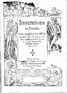 Inventions or Devises, published in 1578, is one of William Bourne's more important works. This book gives many guides and instructional tools for sailors, mostly concerning interactions with other ships. The 21st device listed is the earliest known description of a ship's log and line, which he attributes to Humprey Cole, an officer of the Tower Mint.[1] The 75th device on the list is a description of a night signal or early semaphore system to be used between people on distant ships who had previously decided on a code consisting of a series of lights and fashion of standing.