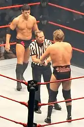 In June, Regal was inserted into a feud with Evolution, after the group's leader Triple H tried to convince Eugene that Regal was secretly plotting against him.[81] After weeks of manipulation, Evolution turned on and attacked Eugene on 12 July episode of Raw, much to Regal's dismay.[82] Triple H would then continue to torment Regal and Eugene, and on 9 August episode of Raw, Regal was kidnapped and brutalised by Triple H in order to gain an advantage against Eugene.[83] At SummerSlam, Regal assisted Eugene in his match against Triple H by attacking his manager Ric Flair. However Eugene would still ultimately lose.[84] In September, Regal teamed with Chris Benoit to defeat Evolution members Batista and Ric Flair at Unforgiven.[85] Regal and Eugene won the World Tag Team Championship from La Résistance on 15 November episode of Raw.[86] However, at New Year's Revolution on 9 January 2005, Eugene injured himself during their tag title defence against Christian and Tyson Tomko. Although they successfully retained the titles, Eugene would be out of action for over six months.[87] This ultimately cost them the Tag Team Championship as Regal lost the titles back to La Résistance at a 16 January house show in Winnipeg, Canada, with announcer Jonathan Coachman as Eugene's replacement.[88] On 7 February episode of Raw, Regal teamed with former tag partner Tajiri to reclaim the titles.[89] On the following week's Raw, Regal and Tajiri faced La Résistance in a rematch for the titles, which they won.[90]