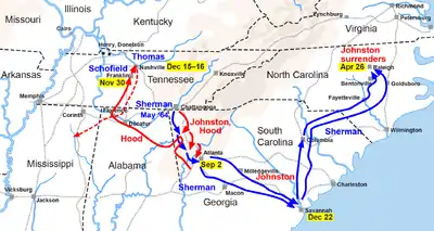 During September and October, Sherman and Hood played cat-and-mouse in north Georgia (and Alabama) as Hood threatened Sherman's communications to the north. Eventually, Sherman won approval from his superiors for a plan to cut loose from his communications and march south, having advised Grant that he could "make Georgia howl".[70] This created the threat that Hood would move north into Tennessee. Trivializing that threat, Sherman reportedly said that he would "give [Hood] his rations" to go in that direction as "my business is down south".[71] However, Sherman left forces under Maj. Gens. George H. Thomas and John M. Schofield to deal with Hood; their forces eventually smashed Hood's army in the battles of Franklin (November 30) and Nashville (December 15–16).[72] Meanwhile, after the November elections, Sherman began a march on November 15[73] with 62,000 men to the port of Savannah, Georgia, living off the land and causing, by his own estimate, more than $100 million in property damage.[74] Sherman called this harsh tactic of material war "hard war," often seen as a species of total war.[75] At the end of this campaign, known as Sherman's March to the Sea, his troops captured Savannah on December 21, 1864.[76] Sherman then dispatched a message to Lincoln, offering him the city as a Christmas present.[77]