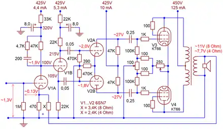 The Williamson amplifier is a four-stage, push-pull, class A triode valve amplifier built around a high quality, wideband output transformer.[59] Its second (concertina-type phase splitter, V1B), third (driver, V2A and V2B) and fourth (output, V3 and V4) stages follow Cocking's Quality Amplifier circuit. The added first stage (V1A) is a dedicated error amplifier, which compensates for the loss of gain caused by negative feedback.[60] Williamson optimized operating points of each stage for best linearity with sufficient overload reserve.[60] The output stage is biased into pure class A; traditionally it used triode-connected beam tetrodes or pentodes. With American 807 or British KT66 valves (Williamson recommended the latter type[61]) and specified power supply the amplifier delivered 15 Watts of output power. Further increase in output, according to Williamson, required use of four output valves; his 1947 article mentions construction of a 70-Watt prototype.[58]