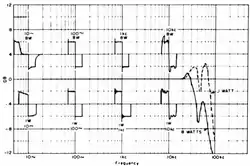 The first attempts to build the Williamson amplifier revealed its tendency to oscillate due to very narrow phase margin. Astor and Langford-Smith, who gave the Williamson excellent ratings,[48] reported that "for fairly large outputs at low frequencies a high frequency oscillation about 60 kC/s [kHz] would commence and be accompanied by a pulsed output of some other frequency".[74] The Australians, armed with first-class test equipment,[lower-alpha 13] suppressed the 60 kHz oscillation with small capacitors on screen grids, but could not identify and suppress the cause of "some other" oscillations.[74] Later, technicians of the United States Naval Research Laboratory examined seven different commercially available Williamson amplifiers, and found that all of them oscillated at infrasonic frequencies of 2...3 Hz.[75] Replacement of output transformers affected stability only at audio and ultrasonic frequencies.[75] The best transformers displayed perfectly flat frequency response from 10 to 100,000 Hz, but were also prone to infrasonic "breathing".[75] The worst transformers displayed prominent ultrasonic resonances that, however, did not cause sustained oscillations. Some "ringed" at relatively low frequencies of 30 to 50 kHz, others extended into 500...700 kHz range.[76]