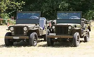The Willys MC, formally the 1⁄4-Ton, 4 x 4, Utility Truck M38, or the G‑740 by its U.S. Army Standard Nomenclature supply catalog designation, is a quarter-ton four-wheel drive military light utility vehicle made by Willys between 1949 and 1952. It replaced (in production), and succeeded the World War II Willys MB and Ford GPW models, with a total production of some 50,000 units — less than one tenth the number of WWII models built.[1] Unlike during WWII, Ford was no longer involved in the production.