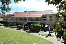 The Governor of Queensland, Sir Leslie Wilson, opened the new purpose-built building (now known as Block D) on 23 September 1933.[49] Located to the northeast of the 1920 building, it was more like a church hall than a school building in form, with a porch at the west end, two double classrooms in the body of the building, separated by a partition, and a classroom on a platform at the east end with a teachers room and lobby each side. There were no verandahs. The roof was gabled with a fleche and windows were standard school casements with fanlights. The classrooms were 12.1 metres (40 ft) wide with a trussed roof.[50][51][1]