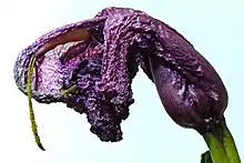 Wilting is the loss of rigidity of non-woody parts of plants. This occurs when the turgor pressure in non-lignified plant cells falls towards zero, as a result of diminished water in the cells. Wilting also serves to reduce water loss, as it makes the leaves expose less surface area.[1] The rate of loss of water from the plant is greater than the absorption of water in the plant. The process of wilting modifies the leaf angle distribution of the plant (or canopy) towards more erectophile conditions.