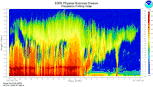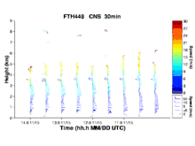 A wind profiler is a type of weather observing equipment that uses radar or sound waves (SODAR) to detect the wind speed and direction at various elevations above the ground. Readings are made at each kilometer above sea level, up to the extent of the troposphere (i.e., between 8 and 17 km above mean sea level). Above this level there is inadequate water vapor present to produce a radar "bounce." The data synthesized from wind direction and speed is very useful to meteorological forecasting and timely reporting for flight planning. A twelve-hour history of data is available through NOAA websites.