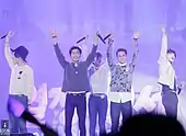 In the lead-up to the group's official comeback, a number of musical covers of their lead singles were released as promotional teasers, featured artists include Lee Hi, Dean, AKMU, Zion.T, Epik High, Taeyang and G-Dragon.[36] Winner returned with EP Exit : E on February 1, 18 months since 2014 S/S.[37] Exit : E debuted at Number 2 on Billboard's World Albums Chart and Number 1 on the Gaon Album chart.[38] Lead singles "Baby Baby" and "Sentimental" topped all eight music streaming platforms in South Korea and achieved a real-time "all-kill", further proving their title as "digital monsters".[39] Their lead single "Baby Baby" received profound attention in China, becoming the most streamed song within the first half of the year among Korean releases on QQ Music, the largest music platform in China.[40] Winner held their first-ever concert tour nationwide starting on March 12 and 13 at Olympic Gymnasiums Arena in Seoul. The group also held additional stops in Gwangju, Daegu and Busan in April.[41][42]