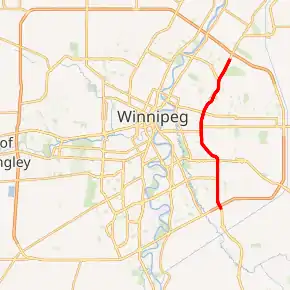 At about 16.7 km (10.4 mi), it is one of the longest roads in the city. It begins in the northeast, running through the suburb of North Kildonan before becoming the boundary between the suburbs of East Kildonan and Transcona. South of the CNR Redditt line, it enters the eastern section of St. Boniface, passing by the CNR Symington Yards and the Royal Canadian Mint before crossing the Perimeter Highway and leaving the city in the extreme southern part of St. Boniface.[2]