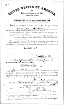 In the years immediately after its development in the late 1890s, radio communication remained completely unregulated in the United States. On November 3, 1906, U.S. representatives meeting in Berlin signed the first International Radiotelegraph Convention, which called for national licensing of radio transmitters.[1] This proposed treaty was brought before the U.S. Senate for ratification in early 1908, but in the face of strong opposition by the largest radio companies it was unable to gain approval.[2]