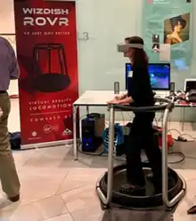 The ROVR consists of a round, concave, low friction platform and a plastic or metal frame for user support. The user slides their feet back and forward on the platform, in a reciprocating motion, to simulate locomotion whilst wearing shoe covers that are designed to reduce friction.[2] The soles of the shoe covers are coated in ceramic discs that reduce friction between the user's feet and the ROVR. Wizdish also sells shoes with ceramic discs already fitted.[3] A contact microphone in the ROVR's platform translates the sound of the user's feet moving into forward movement within virtual reality. A low level of noise, made by slow or small movements on the platform, becomes slow movement in virtual reality, whilst louder noises increase the speed of movement. [4] The user moves in whichever direction the head or hand controllers are facing, as the acoustic sensor system can not detect the movement direction of the feet or the orientation of the body. [5] The concave platform combined with reciprocating movement of the feet minimises vertical movement of a person’s centre of mass and so mimics the best low energy movement of real walking. It also encourages the user's feet to slip back into the centre of the ROVR, stopping the user from moving off the platform. A ring encircles the user at waist height, forming a containment field. This is for user support during orientation and to provide a boundary to stop the user from moving off the platform. Users quickly become used to the platform's surface, and are able to balance without the help of the ring, their hands being free to use independent controllers such as Oculus Touch, Vive wands, Knuckles and the Xbox One Controller.