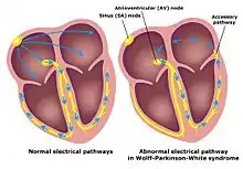 The bundle of Kent is an abnormal extra or accessory conduction pathway between the atria and ventricles that is present in a small percentage (between 0.1 and 0.3%) of the general population.[9][10][11] This pathway may communicate between the left atrium and the left ventricle, in which case it is termed a "type A pre-excitation", or between the right atrium and the right ventricle, in which case it is termed a "type B pre-excitation".[12] Problems arise when this pathway creates an electrical circuit that bypasses the AV node. The AV node is capable of slowing the rate of conduction of electrical impulses to the ventricles, whereas the bundle of Kent lacks this capability. When an aberrant electrical connection is made via the bundle of Kent, tachydysrhythmias may therefore result.