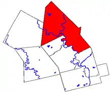 In 1807, Wallace sold the major portion of his tract to Mennonites from Pennsylvania, trustees for the German Company, many of whom would settle this area.[11] Wallace sold 45,185 acres (183 km2) of land to the German Company at $1.00 an acre. Captain Smith, a loyalist from Vermont, settled at the confluence of the Grand and Conestogo Rivers in 1807. Their large log home served as an inn for travelers and he operated a stagecoach for carrying mail from 1835 to 1850. The first church in Woolwich, was built by the Mennonites from Pennsylvania in approximately 1823 at the Three Bridges, now part of Conestogo.[12] Woolwich was incorporated as a Township in 1816, and was part of Halton County until 1842 when it became part of Wellington District. In 1852, it became part of the new Waterloo County.[13]