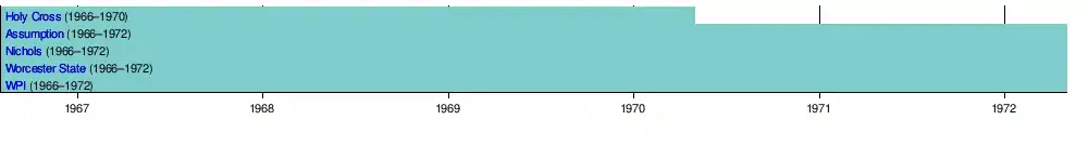 In 1966 a few colleges in the Worcester, Massachusetts area began sponsoring ice hockey as a varsity sport. The schools immediately banded together to form the Worcester Collegiate Hockey League and included the already existing programs at Assumption College and Nichols College. After one season four of the members joined ECAC 2 as well but continued to hold their own conference tournament. Holy Cross left the conference in 1970 to play a more rounded schedule in ECAC 2 play and after a year the three remaining ECAC teams became founding members of ECAC 3. Worcester Polytechnic Institute dropped its ice hockey program after 1972 and the conference was dissolved.