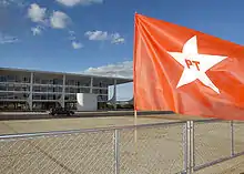 Despite its relatively large number of supporters, the party has been involved in a number of corruption scandals since Lula first came to power and saw its popular support plummet between 2010 and 2016, with presidential approval ratings falling from over 80% to 9%.[14] The party's symbols are the red flag with a white star in the center; the five-pointed red star, inscribed with the initials PT in the center; and the Workers Party's anthem.[15] Workers' Party's TSE (Superior Electoral Court) Identification Number is 13.
