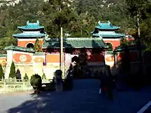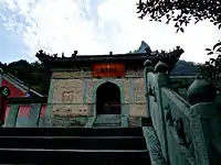 The first site of worship—the Five Dragons Temple—was constructed at the behest of Emperor Taizong of Tang.[5] Further structures were added during the Song and Yuan dynasties, while the largest complex on the mountain was built during the Ming dynasty (14th–17th centuries) as the Yongle Emperor claimed to enjoy the protection of the god Beidi or Xuan Wu.[5] Temples regularly had to be rebuilt, and not all survived; the oldest existing structures are the Golden Hall and the Ancient Bronze Shrine, made in 1307.[5] Other noted structures include Nanyang Palace (built in 1285–1310 and extended in 1312), the stonewalled Forbidden City at the peak (built in 1419), and the Purple Cloud Temple (built in 1119–1126, rebuilt in 1413 and extended in 1803–1820).[5]