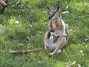 A female yellow-footed rock-wallaby with joey just out of the pouch, the Bristol Zoo