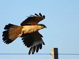 The yellow-headed caracara is 41–46 cm (16–18 in) in length and weighs 325 g (11.5 oz) on average. Like many other birds of prey,[4] the female is larger than the male, weighing 310–360 g (11–13 oz) against the male's 280–330 g (9.9–11.6 oz). Apart from the difference in size, there is no significant sexual dimorphism in this species. It is broad-winged and long-tailed, somewhat resembling a small Buteo. The adult has a buff head, with a black streak behind the eye, and buff underparts. The upper plumage is brown with distinctive pale patches on the flight feathers of the wings, and the tail is barred cream and brown. The head and underparts of immature birds have dense brown mottling.
