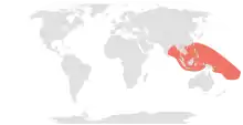 The yellow-lipped sea krait is widespread throughout the eastern Indian Ocean and Western Pacific. It can be found from the eastern coast of India, along the coast of the Bay of Bengal in Bangladesh, Myanmar and other parts of Southeast Asia, to the Malay Archipelago and to some parts of southern China, Taiwan, and the Ryukyu Islands of Japan. The species is also common on Fiji and other Pacific islands within its range. Vagrant individuals have been recorded in Australia, New Caledonia, and New Zealand.[1] Six specimens have been found around the North Island of New Zealand between 1880 and 2005, suspected to have come from populations based in Fiji and Tonga.[4] It is the most common sea krait identified in New Zealand, and second most seen sea snake after the yellow-bellied sea snake - common enough to be considered a native species, protected under the Wildlife Act 1953.[4]