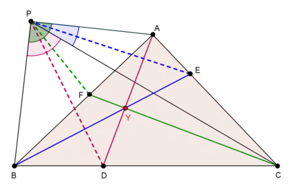 The geometrical construction for locating the Yff center of congruence has an interesting generalization. The generalisation begins with an arbitrary point P in the plane of a triangle ABC. Then points D, E, F are taken on the sides BC, CA, AB such that ∠BPD = ∠DPC, ∠CPE = ∠EPA, and ∠APF = ∠FPB. The generalization asserts that the lines AD, BE, CF are concurrent.[4]