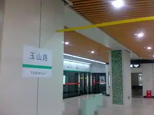 Yushan Lu Station (Chinese: 玉山路站) is a station of Line 1, Suzhou Rail Transit. The station is located in Suzhou New District of Suzhou. It has been in use since April 28, 2012, the same time of the operation of Line 1.[1]