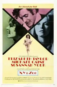 Zee and Co (also known as X Y and Zee and Zee and Company) is a 1972 British drama film directed by Brian G. Hutton and starring Elizabeth Taylor, Michael Caine, and Susannah York. Released by Columbia Pictures, it was based upon a novel by Edna O'Brien.[1] The screenplay concerns a middle-aged, bickering couple whose marriage is on its last legs, and the woman who comes between them.