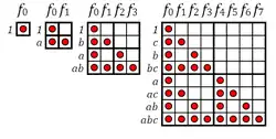 - If the cell in question is 1, add the corresponding term to the Zhegalkin polynomial, then invert all cells in the Karnaugh map where this term is 1 (or belonging to the ideal generated by this term, in a Boolean lattice of monomials) and go to the next cell. For example, if, when examining cell 110, a one appears in it, then the term AB is added to the Zhegalkin polynomial and all cells of the Karnaugh map are inverted, for which A = 1 and B = 1. If unit is in cell 000, then a term 1 is added to the Zhegalkin polynomial and the entire Karnaugh map is inverted.