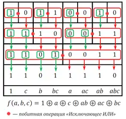 As an aside, note that this method of calculation corresponds to the method of operation of the elementary cellular automaton called Rule 102. For example, start such a cellular automaton with eight cells set up with the outputs of the truth table (or the coefficients of the canonical disjunctive normal form) of the Boolean expression: 10101001. Then run the cellular automaton for seven more generations while keeping a record of the state of the leftmost cell. The history of this cell then turns out to be: 11000010, which shows the coefficients of the corresponding Zhegalkin polynomial. [2][3]