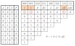 The figure shows a function of three variables, P(A, B, C) represented as a Karnaugh map, which the reader may consider as an example of how to convert such maps into Zhegalkin polynomials; the general procedure is given in the following steps: