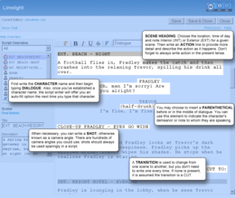 Screenplay Template – The script editor provides a built-in screenplay template which formats the document to a standard for scripts as recommended by the AMPAS.[5] The screenplay document is composed of seven elements: scene, action, character, dialogue, parenthetical, transition and shot (see image). Each element has a specific style to which the script editor conforms as you type.