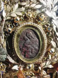One night around 1500 (storytellers and scholars disagree on the year), some herders noticed a wild pear tree radiating light, whose source in the branches turned out to be a jasper oval, about the size of a child's hand, carved with the image of a woman and child and the Slavonic inscription, «More honorable than the cherubim, And more glorious beyond compare than the seraphim, In virginity you bore God the Word; True Mother of God, we magnify you». The portrait was recognizable as an Eleousa or Tenderness type of icon, with the child's cheek against his mother's, and the words as the refrain of the Magnificat in the Eastern liturgy.