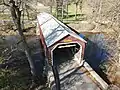 The bridge has a single span, wooden, double Burr arch trusses design with the addition of steel hanger rods. The deck is made from oak planks.[1] It is painted red, the traditional color of Lancaster County covered bridges, on both the inside and outside. Both approaches to the bridge are painted red with white trim.